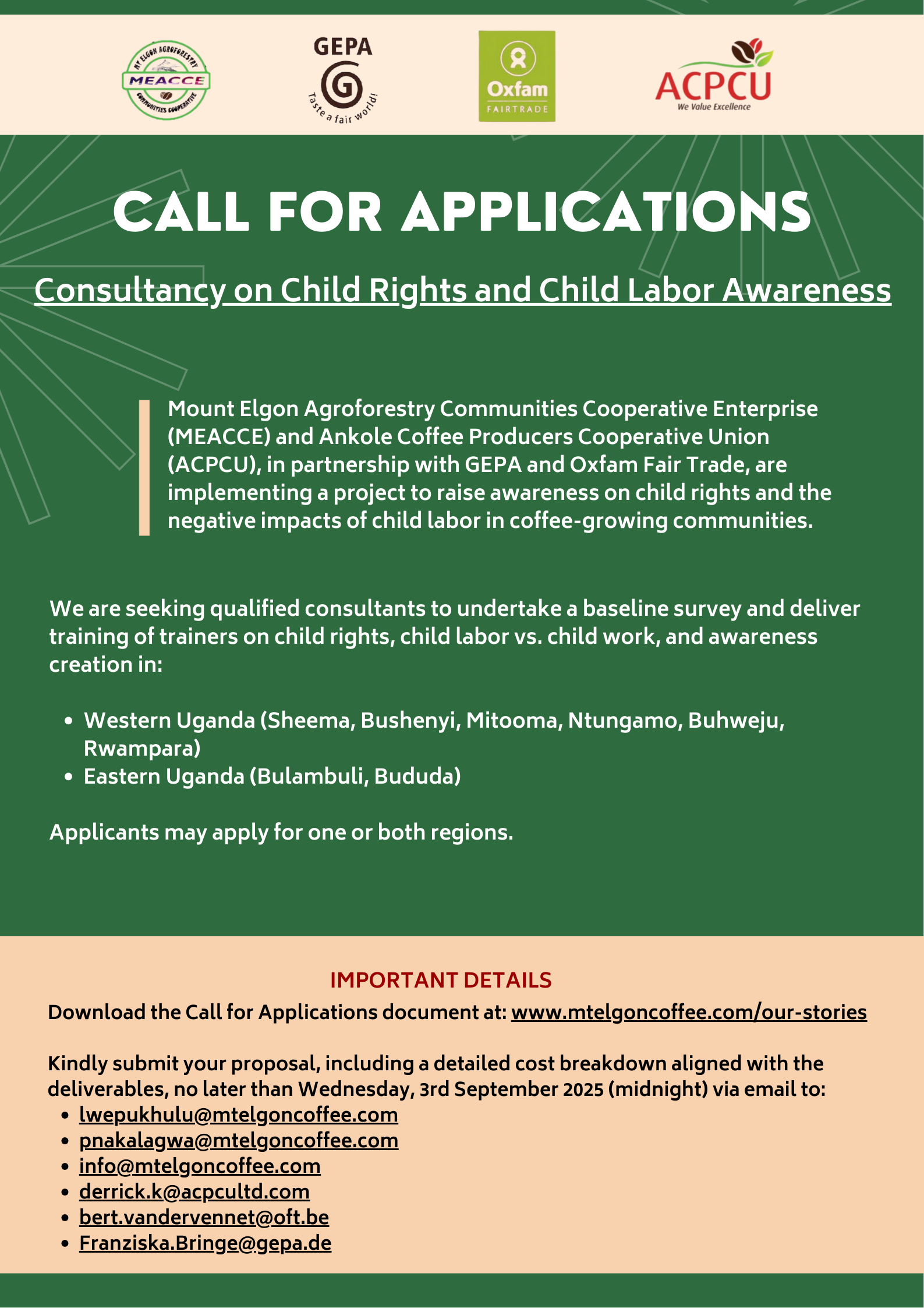 Mount Elgon Agroforestry Communities Cooperative Enterprise (MEACCE) and Ankole Coffee Producers Cooperative Union (ACPCU), in partnership with GEPA and Oxfam Fair Trade, are implementing a project to raise awareness on child rights and the negative impacts of child labor in coffee-growing communities.