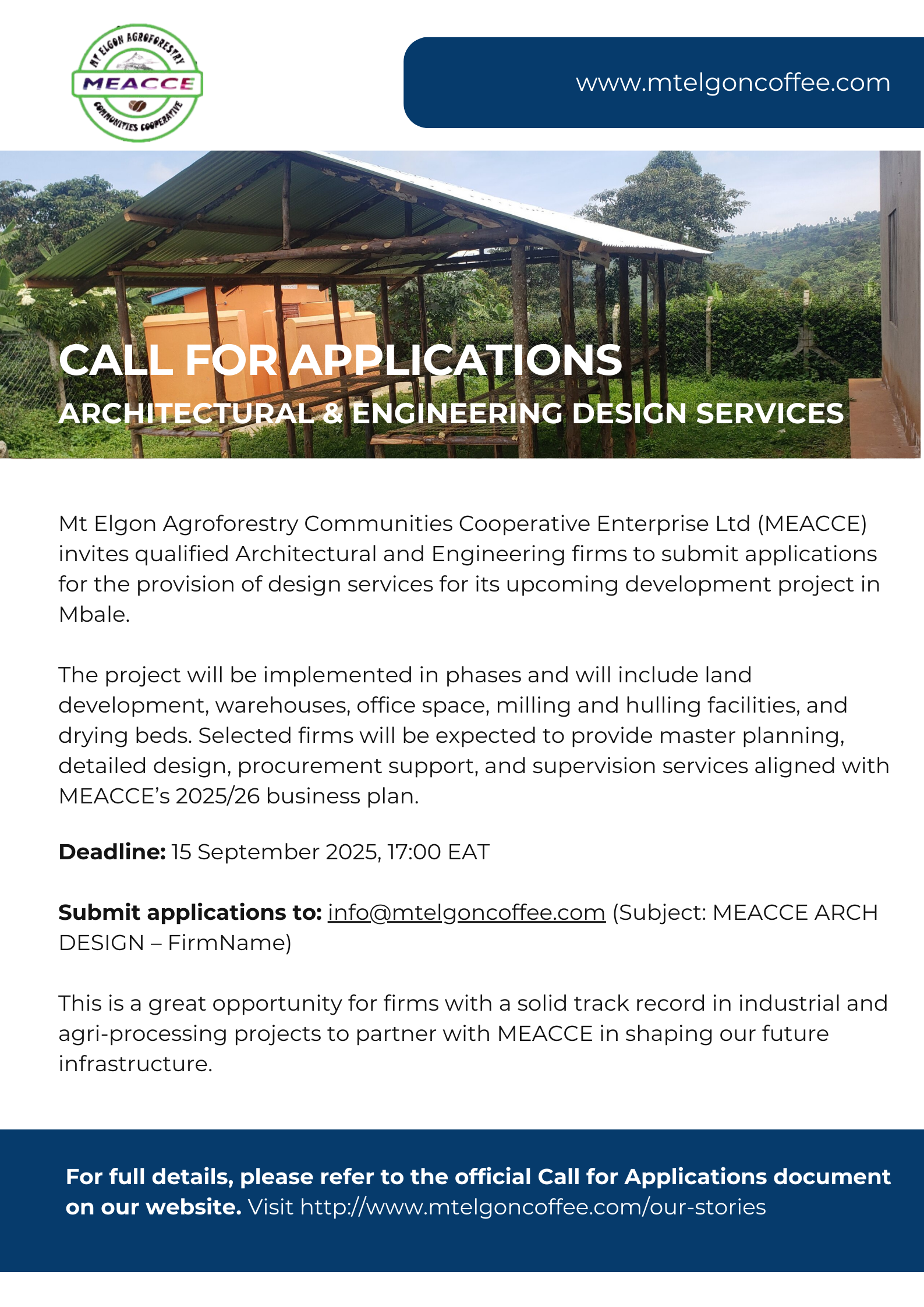 Mt Elgon Agroforestry Communities Cooperative Enterprise Ltd (MEACCE) invites qualified Architectural and Engineering firms to submit applications for the provision of design services for its upcoming development project in Mbale.